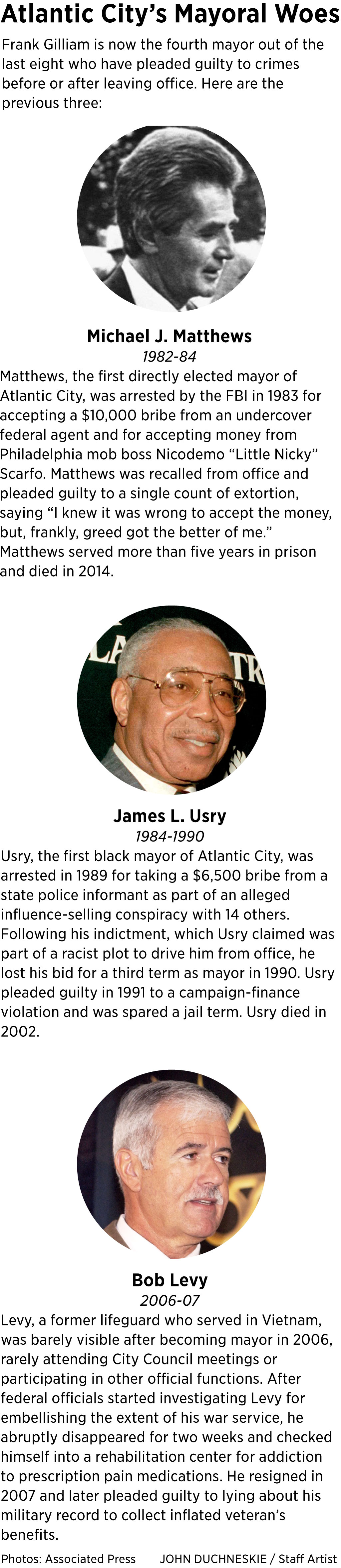 Matthews, the first directly elected mayor of Atlantic City, was arrested by the FBI in 1983 for accepting a $10,000 bribe from an undercover federal agent and for accepting money from Philadelphia mob boss Nicodemo “Little Nicky” Scarfo. Matthews was recalled from office and pleaded guilty to a single count of extortion, saying, “I knew it was wrong to accept the money, but, frankly, greed got the better of me.” Matthews served more than five years in prison and died in 2014.