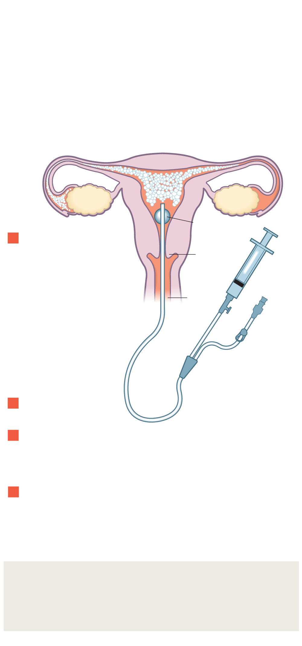 The doctor uses a syringe, filled with a mixture of saline and air bubbles,* and injects the mixture into the uterine cavity through a small catheter with a small balloon near the tip that is inflated to stop the fluid from running back through the cervix.
