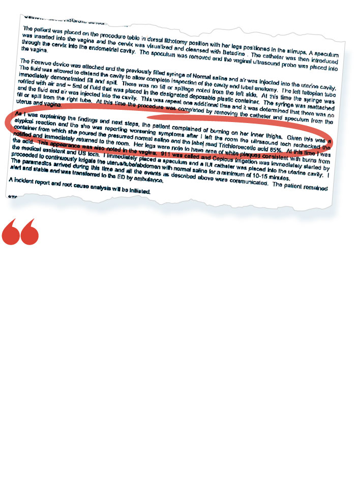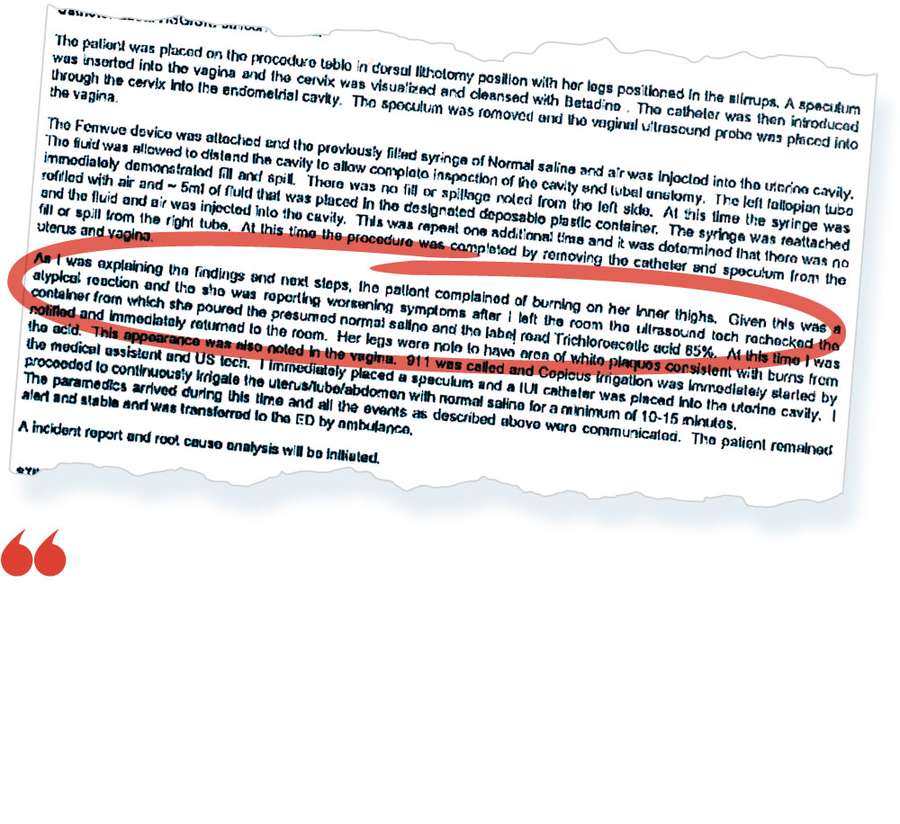 As I was explaining the findings and next steps, the patient complained of burning on her inner thighs. Given this was a atypical reaction and she was reporting worsening symptoms after I left the room, the ultrasound tech rechecked the container from which she poured the presumed normal saline and the label read Trichloroacetic acid 85%.