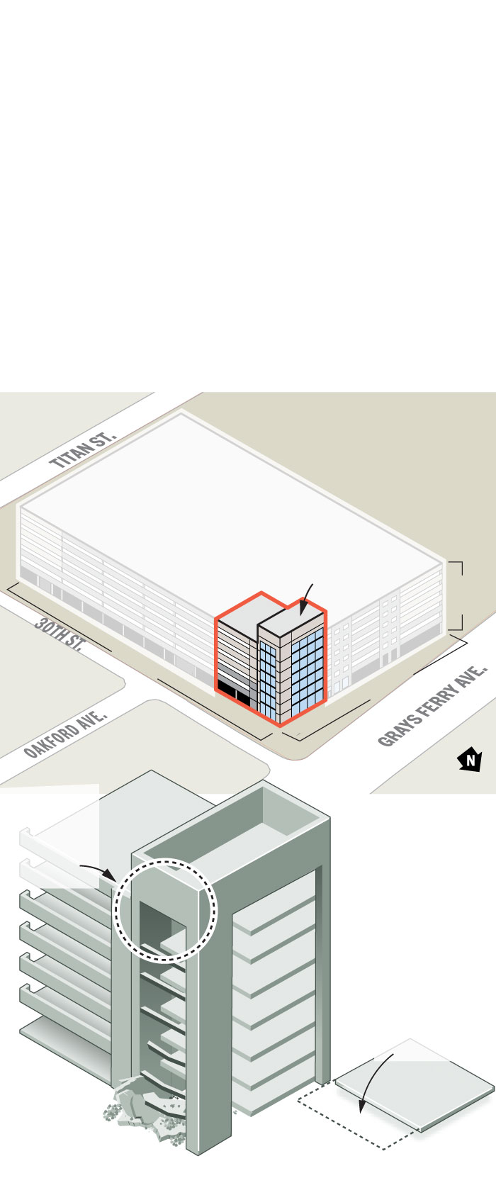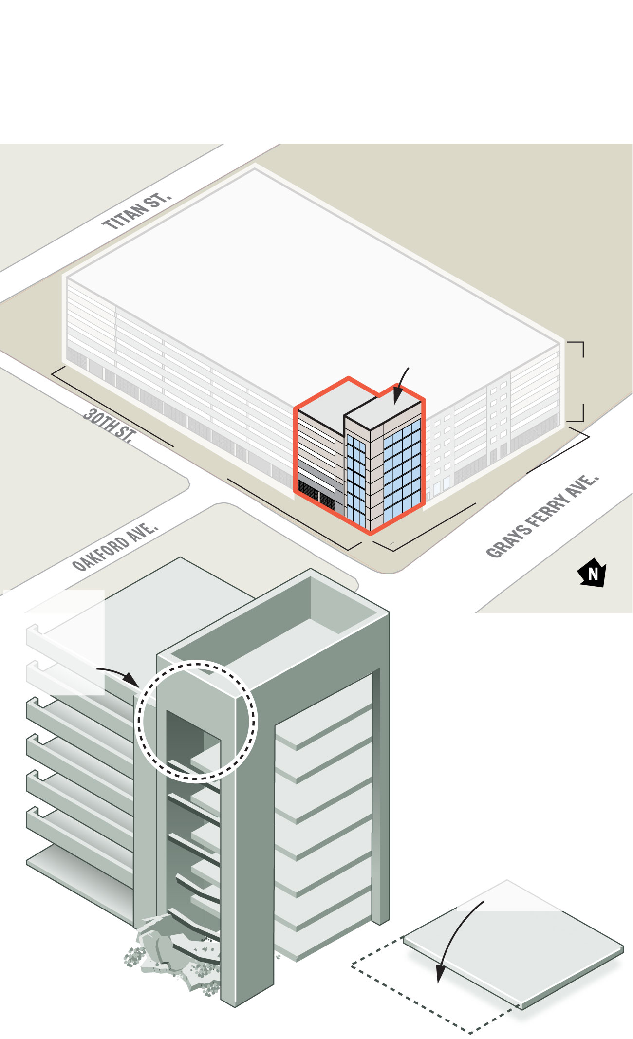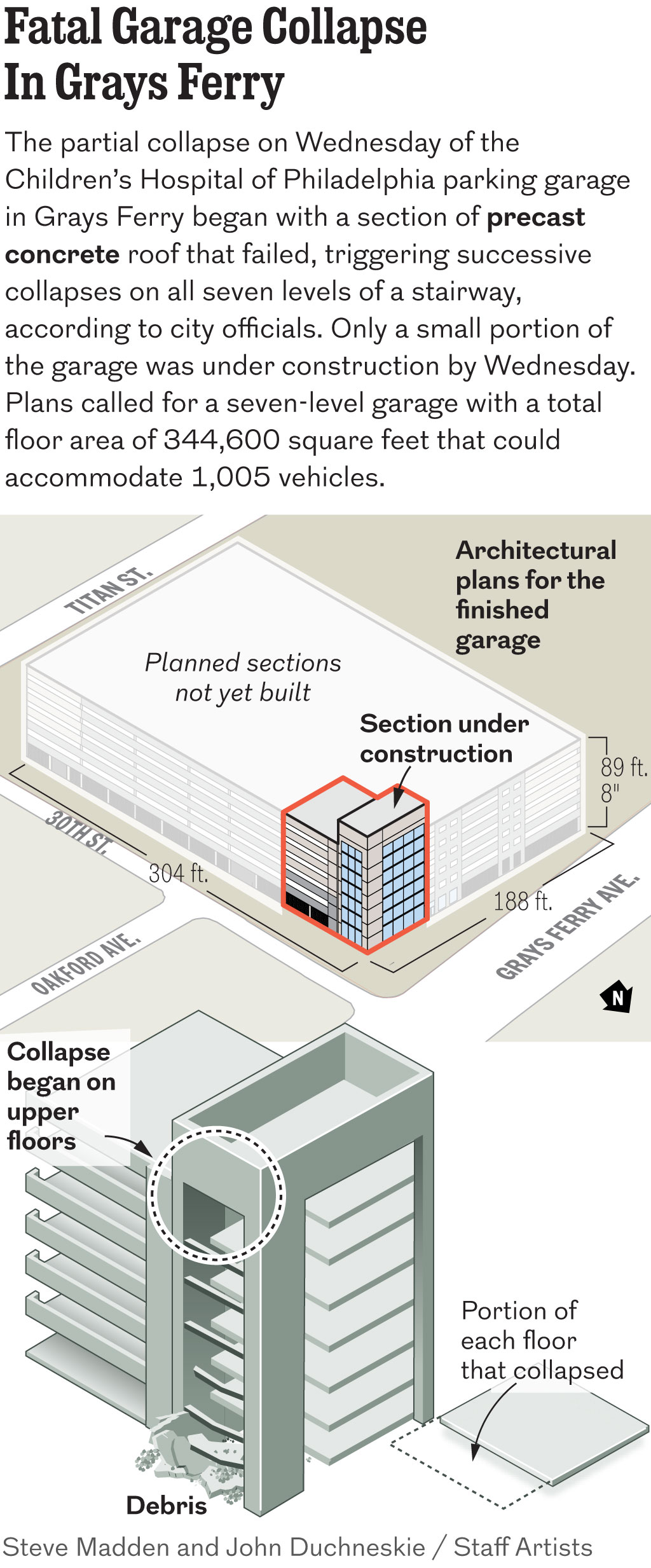 The partial collapse on Wednesday of the Children’s Hospital of Philadelphia parking garage in Grays Ferry began with a section of precast concrete roof that failed, triggering successive collapses on all seven levels of a stairway, according to city officials. Only a small portion of the garage was under construction by Wednesday. Plans called for a seven-level garage with a total floor area of 344,600 square feet that could accommodate 1,005 vehicles.