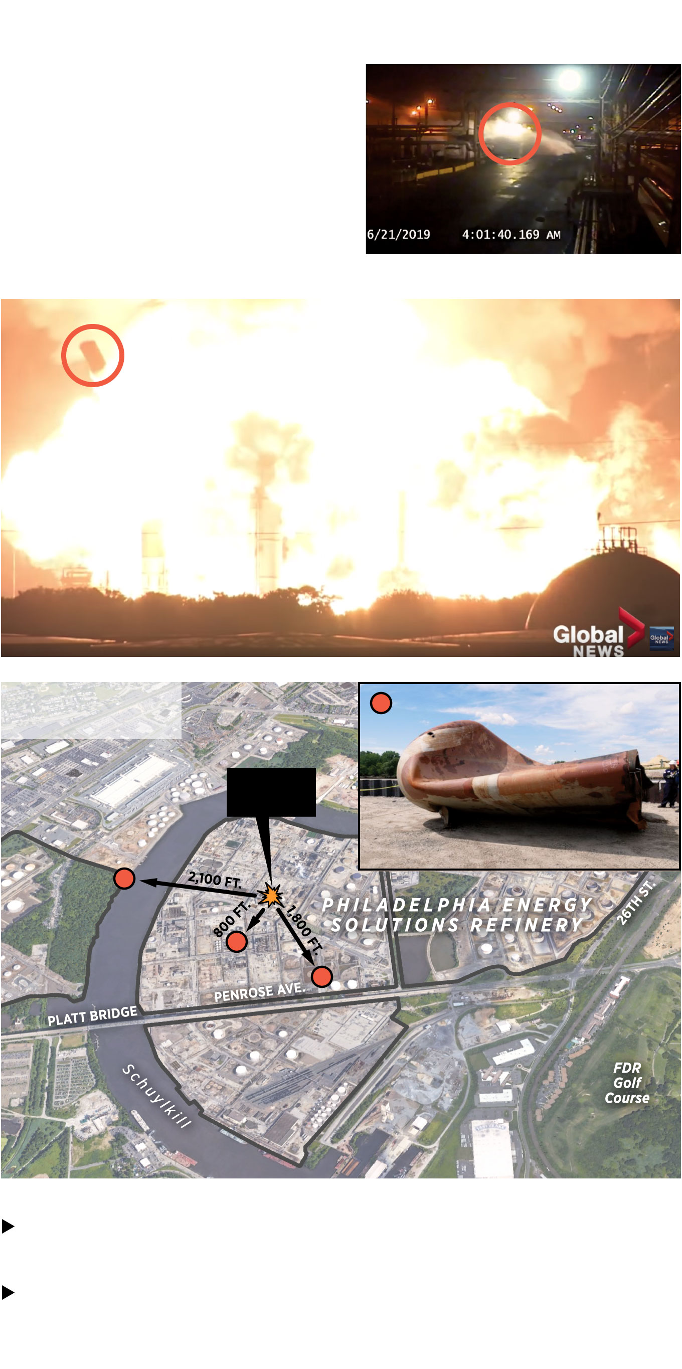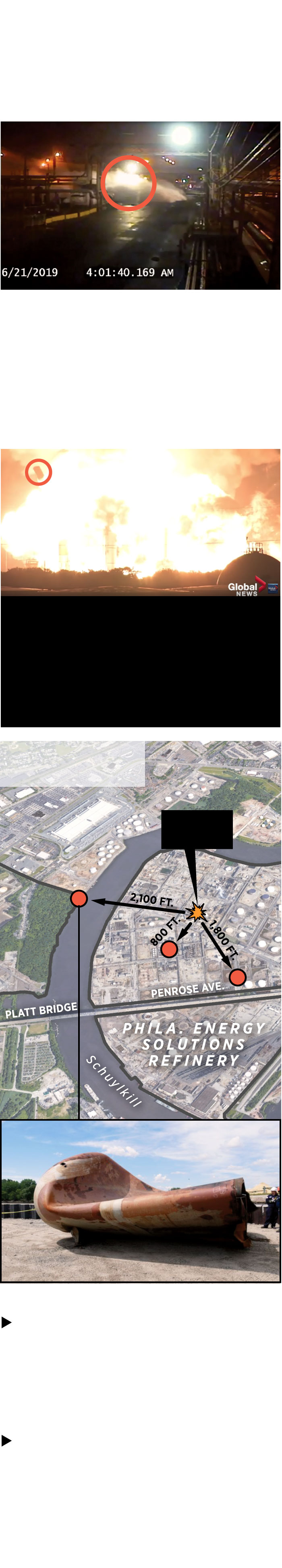 4:22: A third explosion occurs when a drum containing butylene, isobutane, and butane ruptures. The force of the explosion sends a 38,000-pound drum fragment across the Schuylkill, 2,100 feet away. Two other large fragments land 1,800 and 800 feet away, within the refinery grounds.