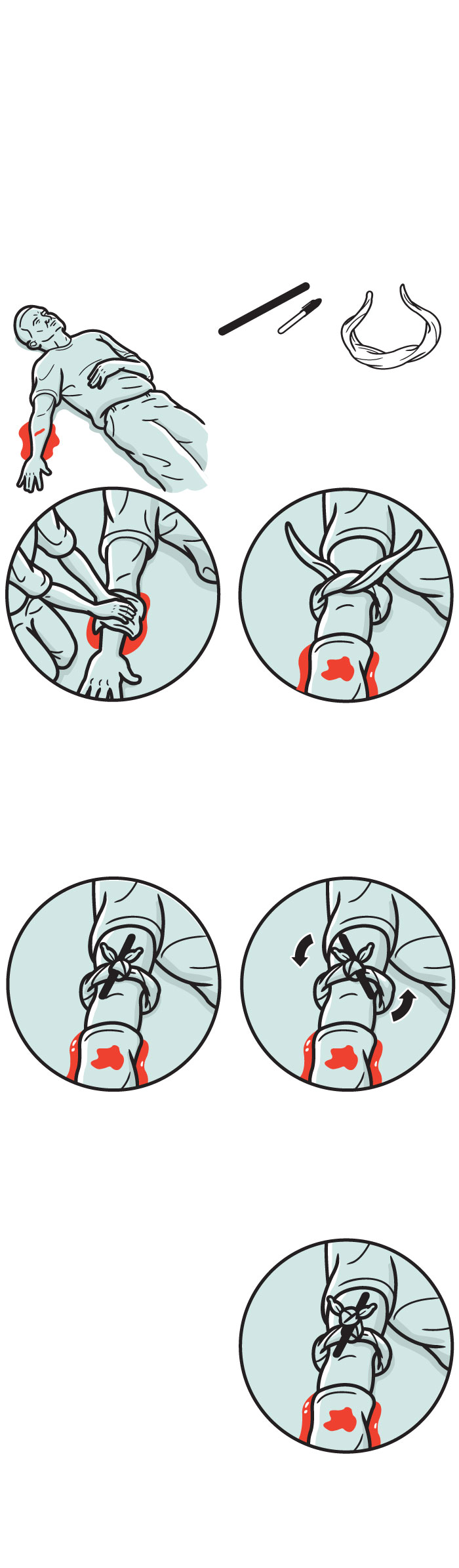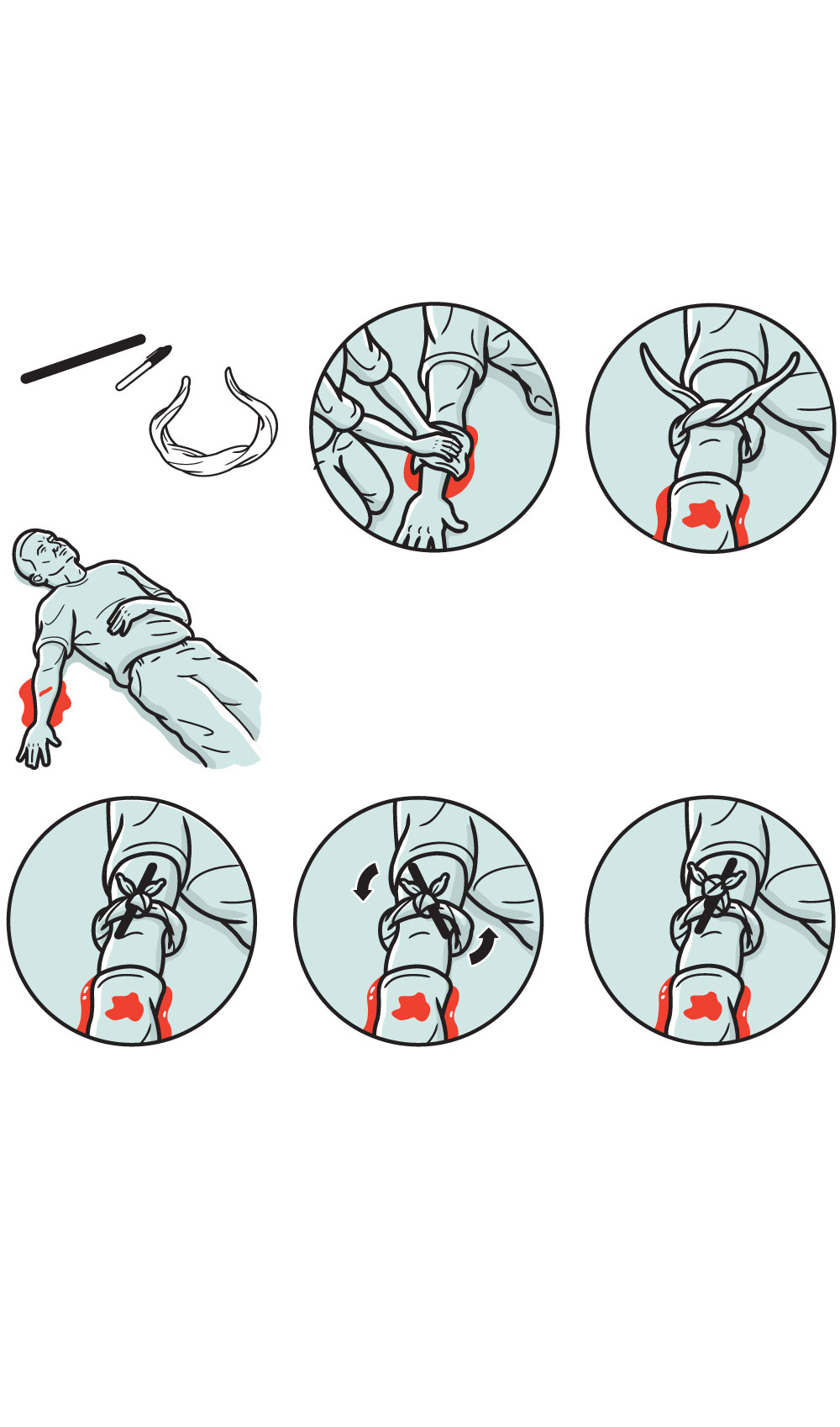 Making and applying a tourniquet is a simple technique that can slow rapid blood loss from a traumatic injury until the victim can receive medical attention. It can only be applied to the limbs, not the neck or torso. Don’t try this unless you are really sure you can use the stick to make it tight enough to decrease the bleeding. An ineffective tourniquet can cause more harm than good.