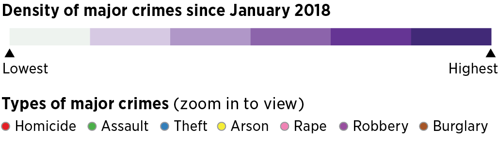 The 3700 block of North 15th Street is in an area of North Philadelphia with a relatively modest rate of major crime, but is near the high-crime intersection of Broad Street and Erie Avenue. The map below shows major crimes in the 39th and 25th police districts from Jan. 1, 2018, through Aug. 20, 2019.