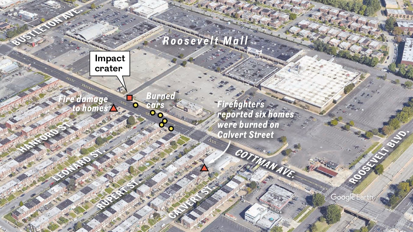 This 2022 image from Google Earth, annotated after Friday’s plane crash, shows locations of burned cars on Cottman Avenue, an impact crater at an entrance to Roosevelt Mall, and some of the homes that sustained fire damage.